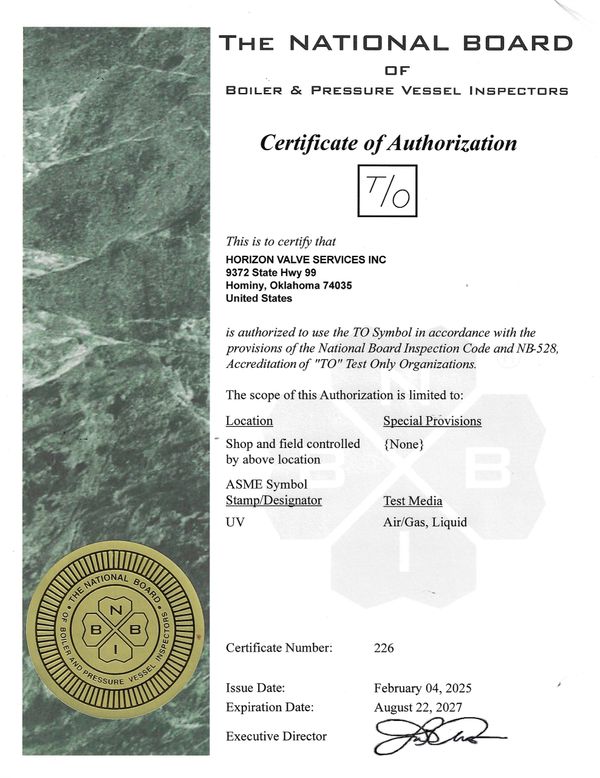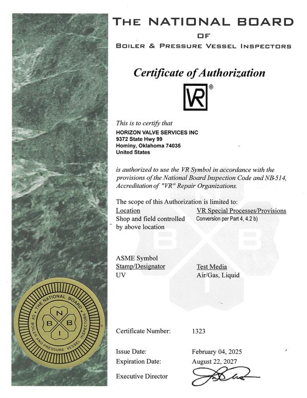 Using only OEM parts for the repairs and ensuring high quality each time, you can place your full confidence in the Horizon Valve Services Relief Valve team. Horizon Valve offers a one-year warranty on all our services; providing you sound mind and confidence when you choose us for your valve servicing needs. Our Relief Valve Division is compliant with NBBI, maintaining, NB, VR, and T/O certifications.